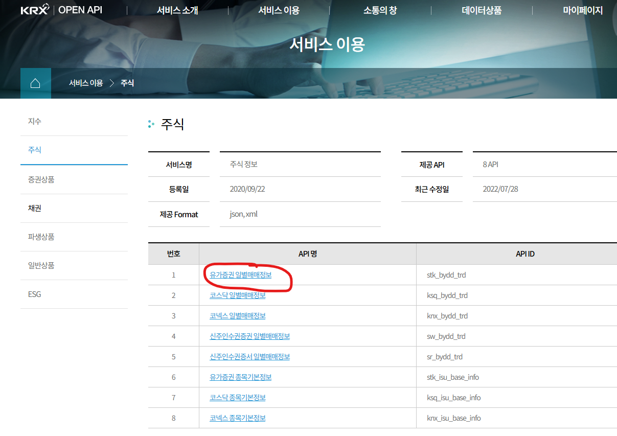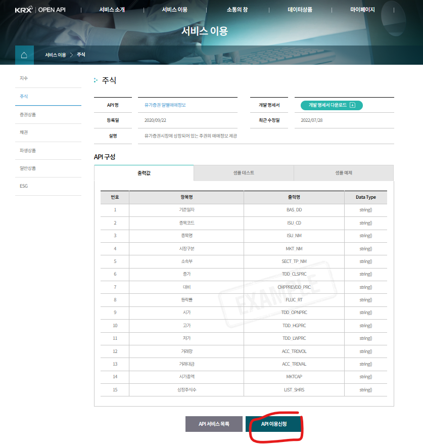예를들어 우리는 [서비스이용] > [주식] > [유가증권 일별매매정보] 가 필요하다고하면@!