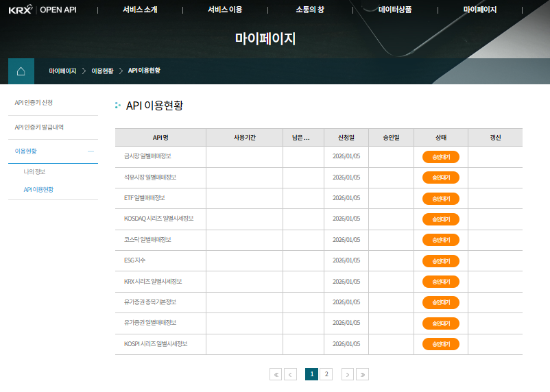 오늘은한국거래소 Data Marketplace의 OPEN API 키를 신청하고 사용해보겟습니다~!