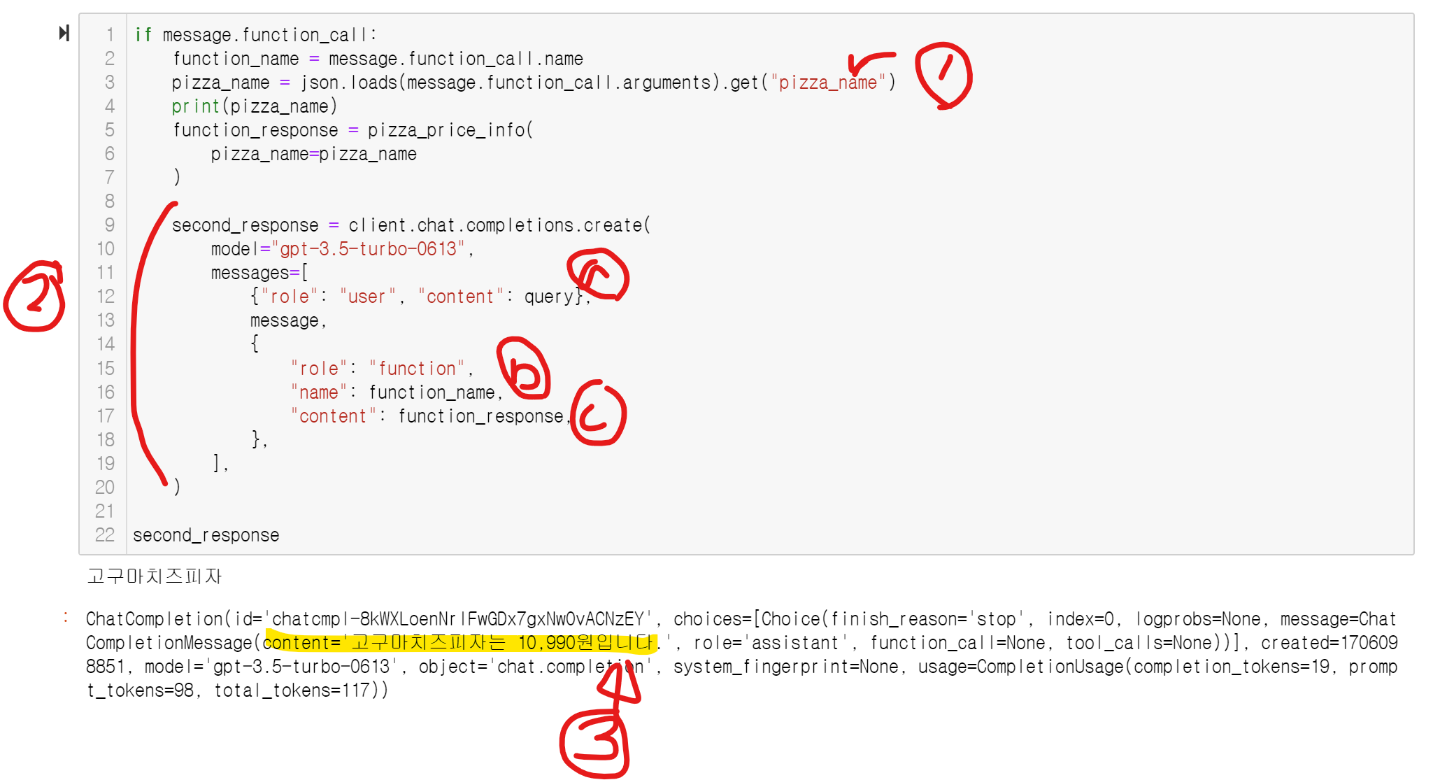 위 함수를 GPT API와 연동시켜, 피자 가격을 물어보면 답변하게 만들어봅시다!!