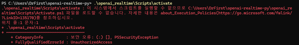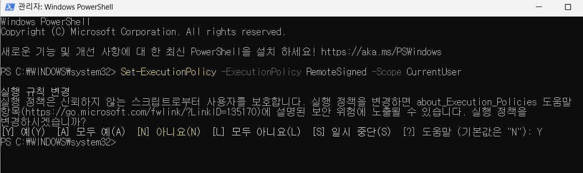 | 이떄 만약 아래와 같은 에러가 뜬다면!? + CategoryInfo : 보안 오류: (:) [], PSSecurityException + FullyQualifiedErrorId : UnauthorizedAccess ![]() 관리자 권한으로 powershell 을 켜고 Set-ExecutionPolicy -ExecutionPolicy RemoteSigned -Scope CurrentUser 를 입력해주세요!! ![]() |